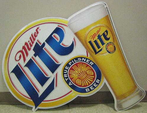 -- Description : 1999 Miller Lite large advertising sign. Appears to be made of light aluminum. Also appears to have not been used (new old stock). Still has protective material covering adhesive strips that can be used to hang the sign on a wall. Measures about 35 inches across at its longest length points and 41 inches diagonally.