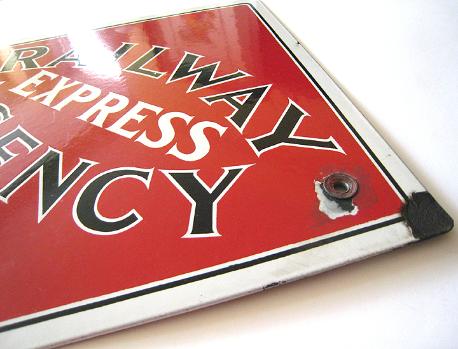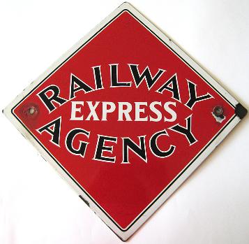 -- Item Name: Railway Express Agency 3 Color Diamond -- Price: $120.00 -- Description : Porcelain Railway Express Agency diamond sign. Measures 12 inches square. Some chipping and touch up at the two mounting holes. Look at photos for condition.