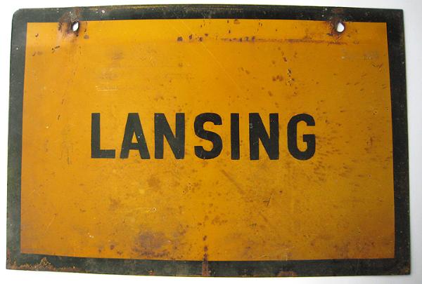 -- Item Name: Vintage Metal Train Station Destination Sign Lansing Michigan MI -- Price:SOLD -- Description : Original train station sign designating trains to Lansing, Michigan. Made of metal. Measures 12 by 18 inches.
