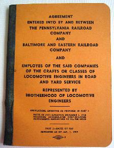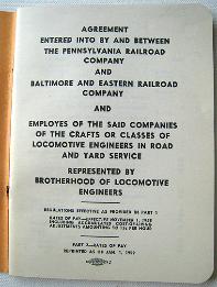 -- Item Name: 1959 PRR Pennsylvania Railroad Baltimore & Eastern Agreement Book -- Price: $25.00 -- Description : Original Agreement booklet between Pennsylvania Railroad and Baltimore and Eastern Railroad locomotive engineers showing rates of pay for passenger, freight and yard service. Also includes weights of engine on drivers tables on diesel, electric and steam locomotives. Contains 44 pages.
